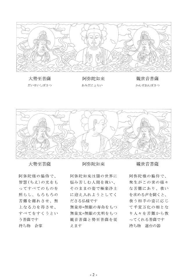 陀ー尊来迎図、山越来迎図、還来迎図等種々ありますが来迎図の多くは、阿弥陀佛の他二